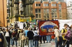 Scope and ContentColour photograph of demonstrators in Albert Square, Manchester. There are various banners including the National Coalition of Anti Deportation Campaigns, National Union of Journalists and UNISON Salford City Branch