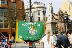 Scope and ContentColour photograph of the Manchester Green Party banner in Albert Square, Manchester
