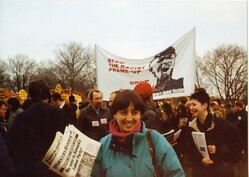 Scope and ContentColour photographs of demonstrators. In the foreground is a woman holding a copy of Workers' Hammer and in the background there is a Workers against Racism banner