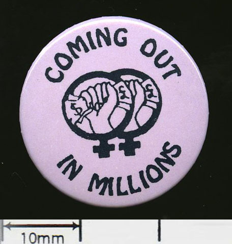 Scope and ContentTin badge with an image of two female symbols interlocked and with clenched fists holding paper money and the text: Coming out in millions