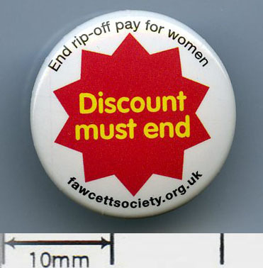 Scope and ContentTin badge with the text: Discount must end. End rip-off pay for women. Fawcettsociety.org.uk