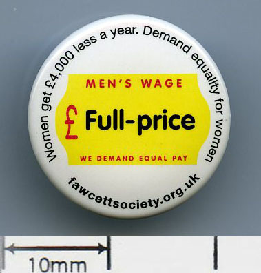 Scope and ContentTin badge with the text: Women get �4000 less a year. Demand equality for women. Men's wage � full price. We demand equal pay. Fawcettsociety.org.uk
