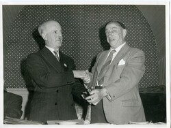 Scope and ContentBlack and white photograph of a man receiving a presentation from another man (2 copies)