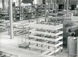 Scope and ContentBlack and white photograph of the factory floor with stacked timber in the background