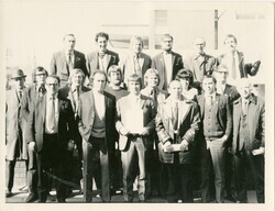 Scope and ContentBlack and white photograph of a group of men showing John Fergusson (2nd left), Johnny Sproston (top right), Harry Crellin (front with placard) and George Taylor (left behind Harry Crellin)