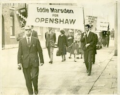 Scope and ContentBlack and white photograph showing a Communist Party march. Eddie Marsden, the Communist candidate for Openshaw is in the foreground, with Stan Cole holding the right-hand banner pole, Jack Cadwallader, centre, under the banner and Muriel Taylor on the left, behind a woman and child