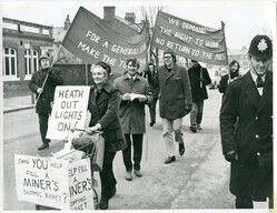 Scope and ContentBlack and white photograph of Communist Party members demonstrating during 3 day week. Angela Tuckett is at the head of the march