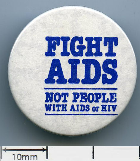 Scope and ContentTin badge with the text: Fight AIDS not people with AIDS or HIV