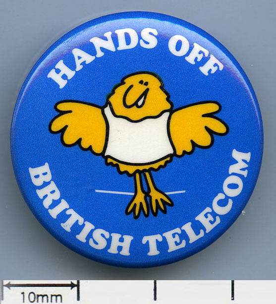 Scope and ContentTin badge with an image of a cartoon bird [Buzby] and the text: Hands off British Telecom