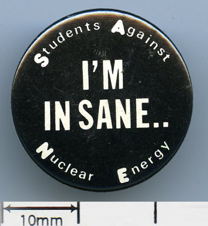Scope and ContentTin badge with the text: I'm in SANE. Students Against Nuclear Energy.