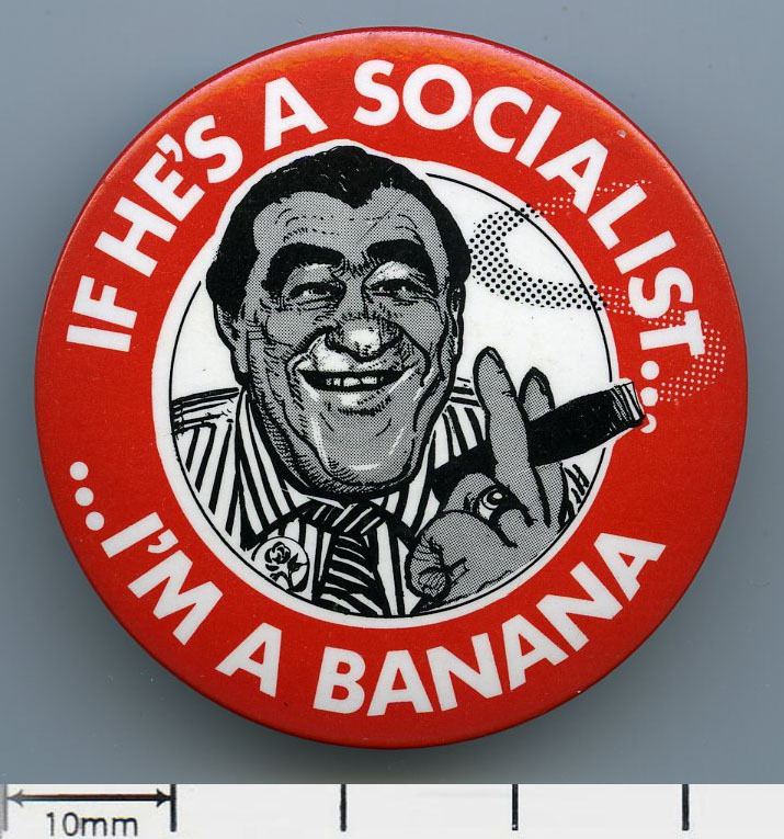 Scope and ContentTin badge with an image of Robert Maxwell and the text: If he's a socialist � I'm a banana