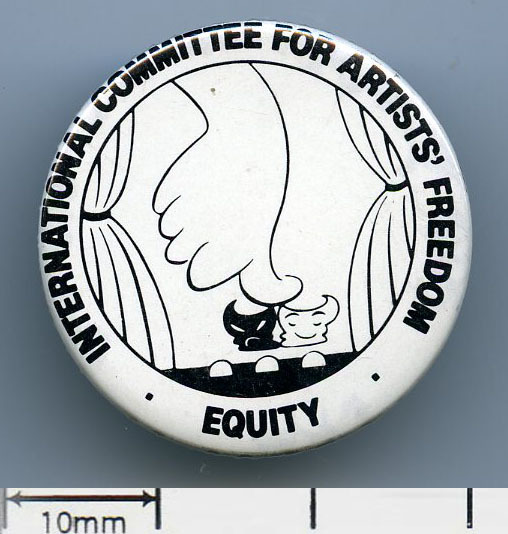 Scope and ContentTin badge with an image of two cartoon figures on stage being pressed down on by a thumb and the text: National Committee for Artists' Freedom. Equity