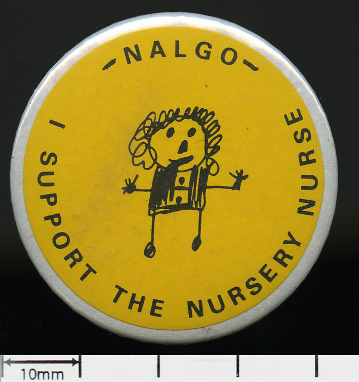 Scope and ContentTin badge with a child's drawing of a person and the text: Nalgo. I support the Nursery Nurse