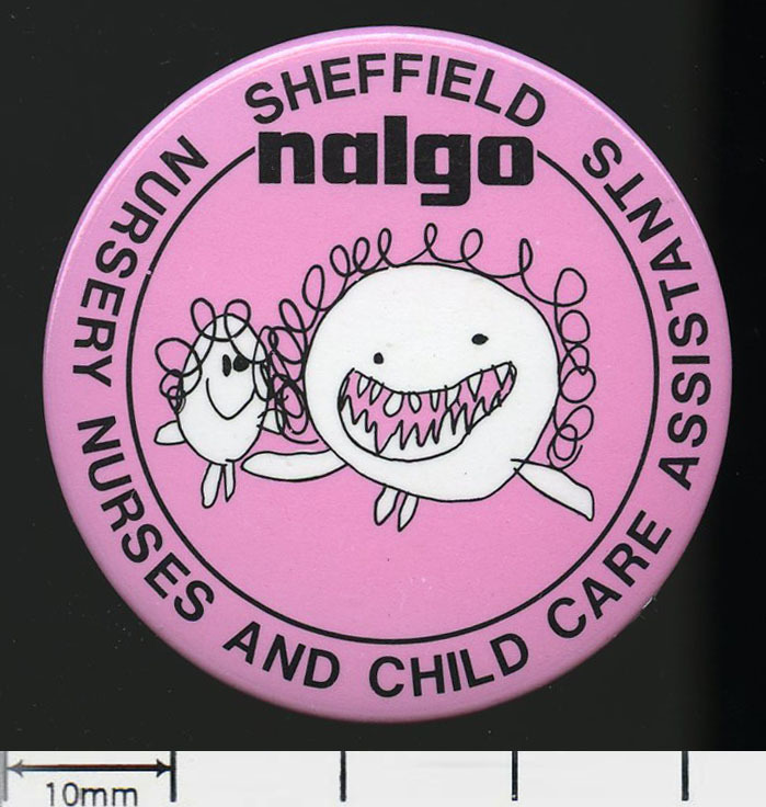Scope and ContentTin badge with a child's drawing of a person and a childe and the text: Sheffield nalgo. Nursery Nurses and Child Care Assistants