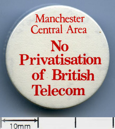 Scope and ContentTin badge with the text: Manchester Central Area. No privatisation of British Telecom.