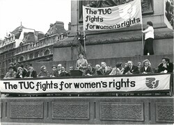 Scope and ContentBlack and white photograph of a demonstration in Trafalgar Square, London. Two banners read: The TUC fights for womens rights. There is a long table on the monunment and a woman is speaking .