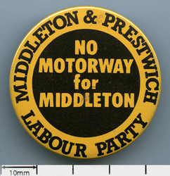 Scope and ContentTin badge with the text: Middleton and Prestwich Labour Party. No motorway for Middleton