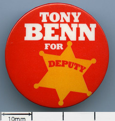Scope and ContentTin badge with an image of a Sheriff's star and the text: Tony Benn for Deputy
