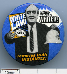 Scope and ContentTin badge with an image of Willie Whitelaw holding a box of washing powder labelled Whitelaw. With SPG and a white helmet and the text: White washes whiter! Removes truth instantly