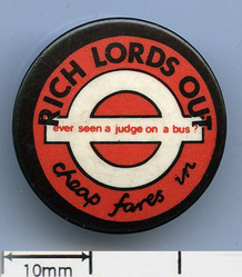 Scope and ContentTin badge with an image of the London Transport logo with the text: Rich lords out. Cheap fares in. Ever seen a judge on a bus?