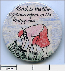 Scope and ContentTin badge with an image of a woman planting crops and the text: Land to the tiller. Agrarian reform in the Philippines