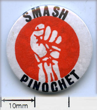 Scope and ContentTin badge with an image of a clenched fist and the text: Smash Pinochet