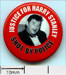 Scope and ContentTin badge with an image of Harry Stanley and the text: Justice for Harry Stanley, Shot by Police
