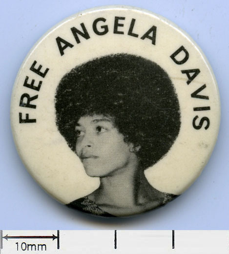 Scope and ContentTin badge with an image of Angela Davis and the text: Free Angela Davis