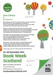 Scope and ContentPoster with the text of a poem entitled Dear Library 5 by Jackie Kay. The poem is based on answers given to her by her father when she interviewed him about what libraries meant to him. The poster is inscribed: To the WCML, Jackie Kay, June 2023