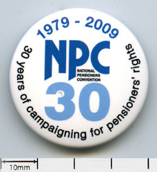 Scope and ContentTin badge with the text: NPC 30. National Pensioners Convention. 30 years of campaigning for pensioners rights. 1979-2009