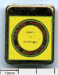 Scope and ContentEnamel badge with the text: Salford Pensioners TU Association. Dignity in retirement