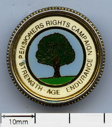 Scope and ContentEnamel badge with an image of a tree and the text: Pensioners Rights Campaign, Strength. Age Endurance