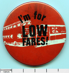 Scope and ContentTin badge with images of a train and a bus and the text: I'm for low fares!