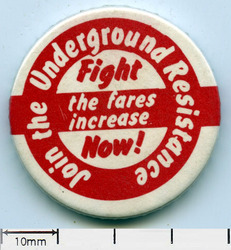 Scope and ContentTin badge with the text: Join the Underground resistance. Fight the fares increase now!