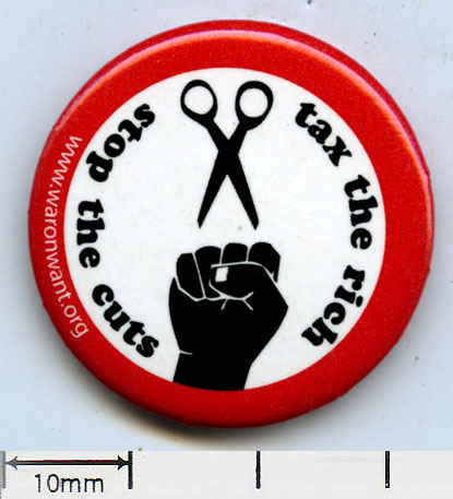 Scope and ContentTin badge with an image of a clenched fist and a pair of scissors and the text: Tax the rich. Stop the cuts. www.waronwant.org