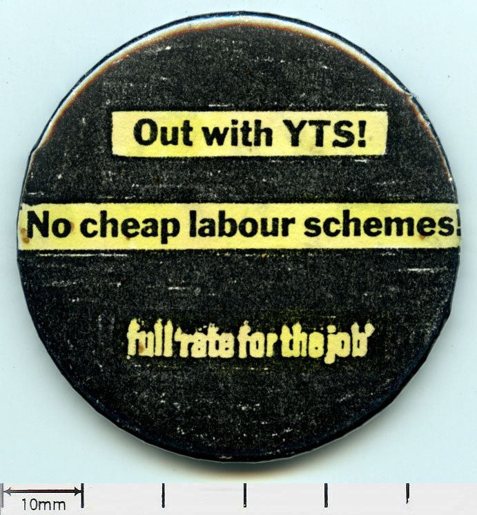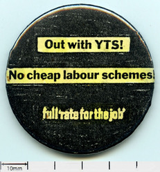 Scope and ContentTin badge with the text: Out with YTS! No cheap labour schemes. Full 'rate for the job'