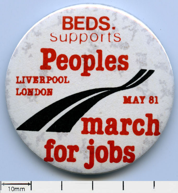 Scope and ContentTin badge with the text: Beds. supports Peoples March for Jobs. Liverpool London. May '81