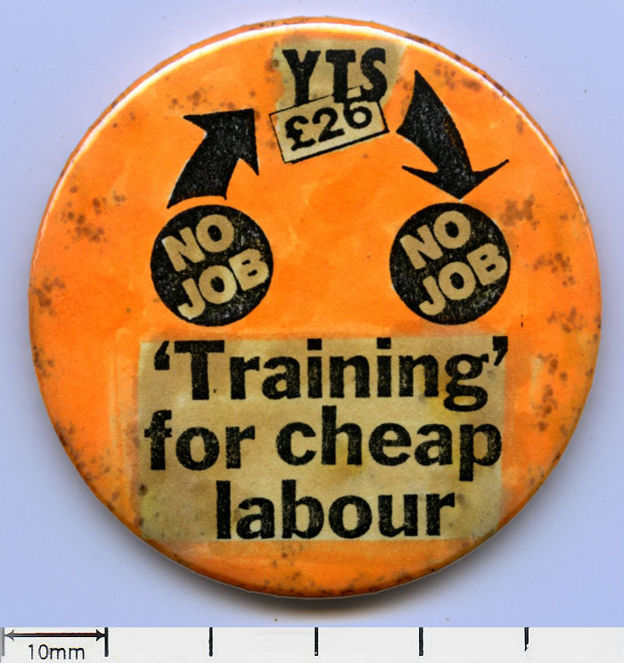 Scope and ContentTin badge with the text YTS £26. No job. Training for cheap labour