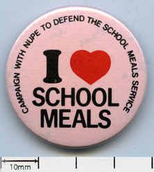 Scope and ContentTin badge with an image of a heart and the text: I [love] school meals. Campaign with NUPE to defend the school meals service