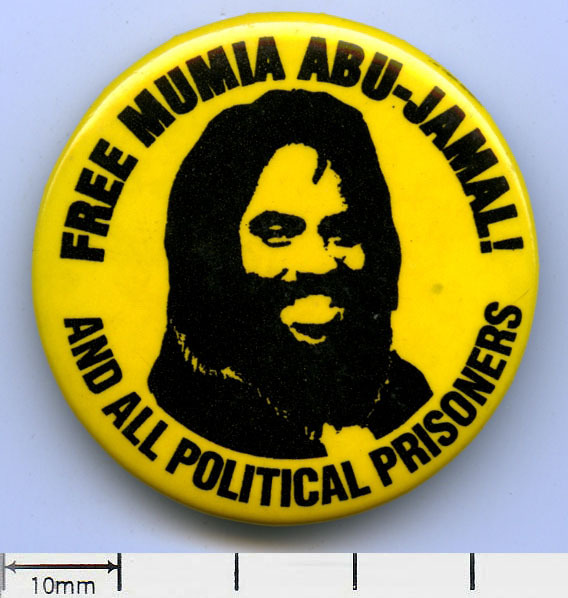 Scope and ContentTin badge with an image of Mumia Abu-Jamal and the text: Free Mumia Abu-Jamal and all political prisoners
