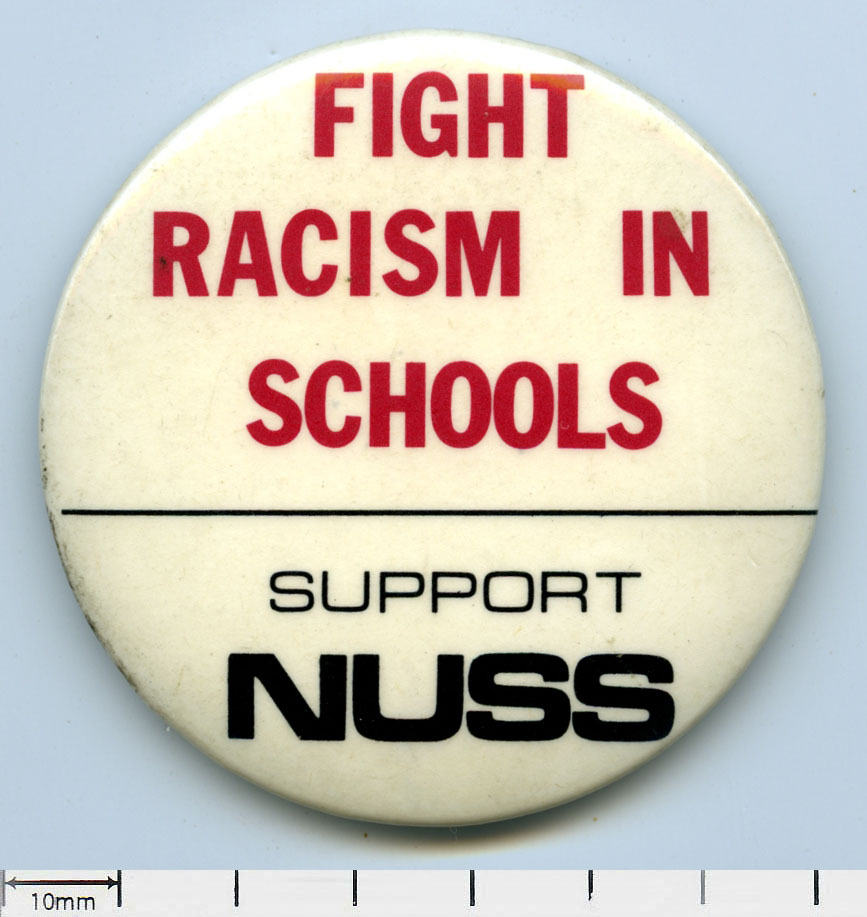 Scope and ContentTin badge with the text: Fight racism in schools. Support NUSS.