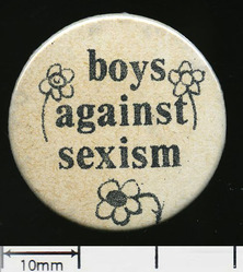 Scope and ContentTin badge with images of flowers and the text: Boys against sexism
