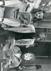 TitlePhotograph - Three people looking at The Leveller, 1981