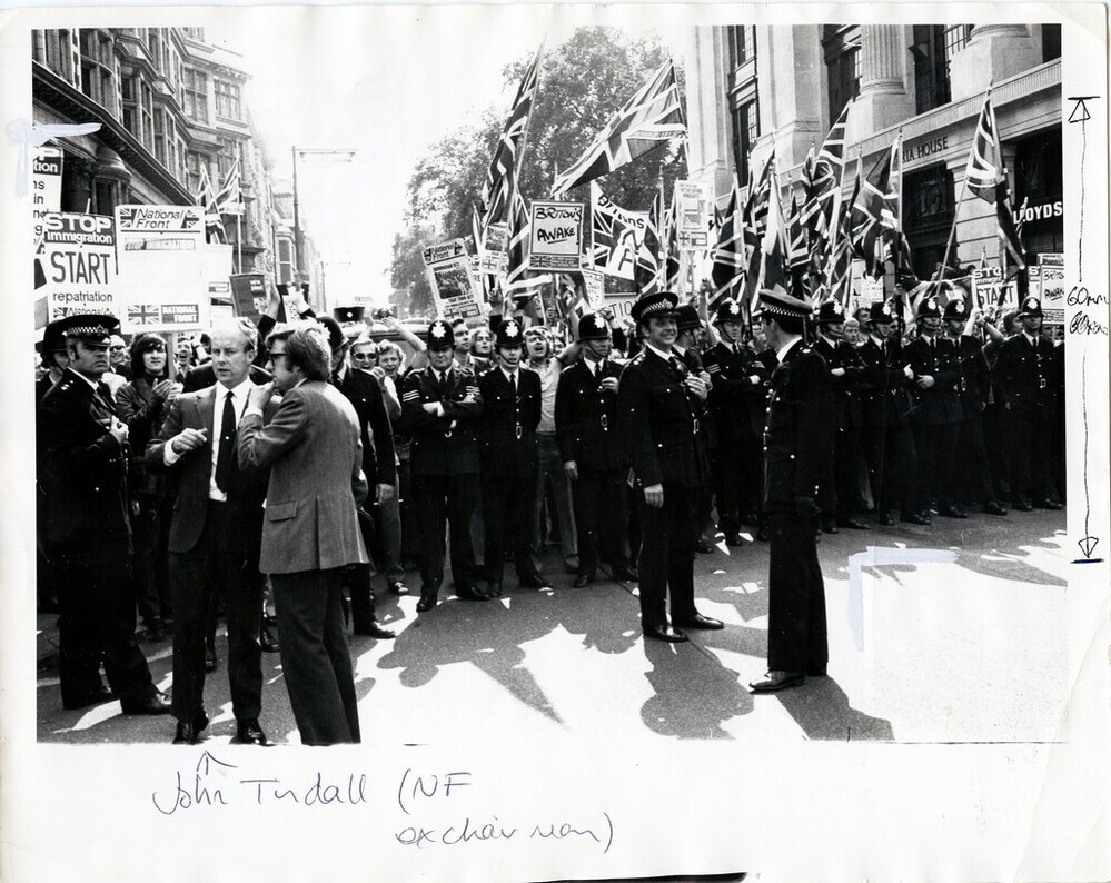 Scope and ContentBlack and white photograph of a group of National Front demonstrators behind a line of police officers. John Tyndall (ex-chair, National Front) is in the foreground talking to another man. Caption on the back reads: Liberation v Nat. Front demo, Red Lion Sq. 15 June 74
