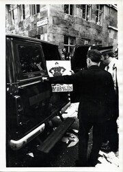 Scope and ContentBlack and white photograph of a police officer putting a placard in the back of a van with a man watching him. The placard show a Nazi officer. Caption on the back reads: Police clearing up after Nat. Front v Liberation demo, Red Lion Sq. 15 Jun