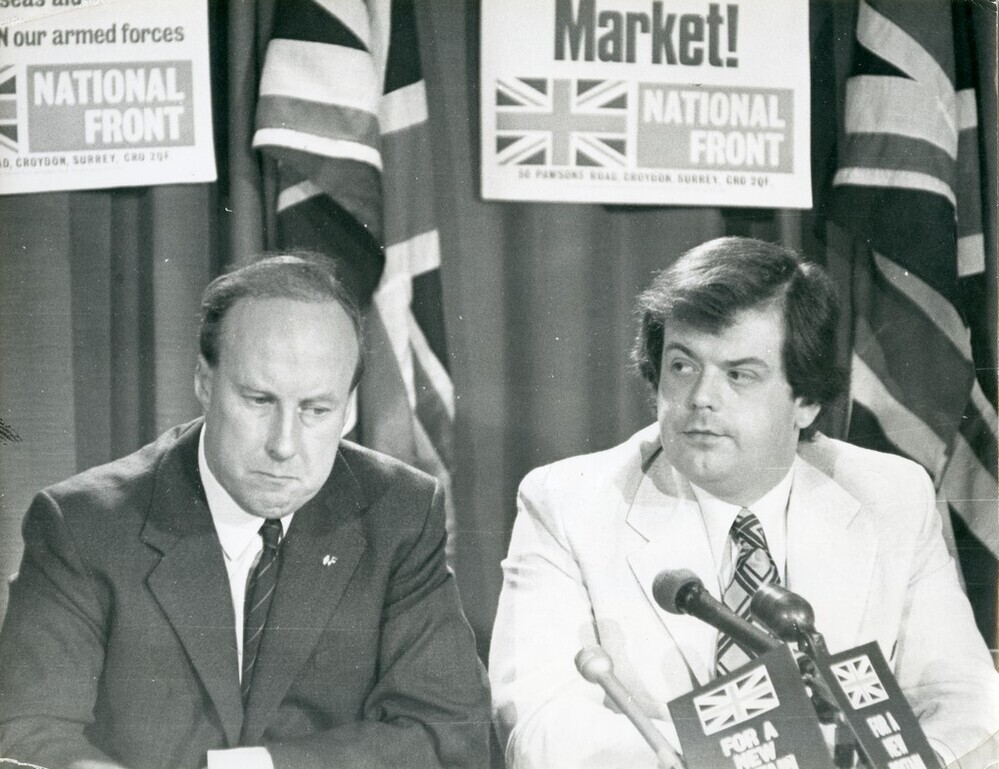 Scope and ContentBlack and white photograph of John Tyndall and Martin Webster launching the National Front's election manifesto, They are seated at a desk with microphones in front of them and posters and union flags behind them