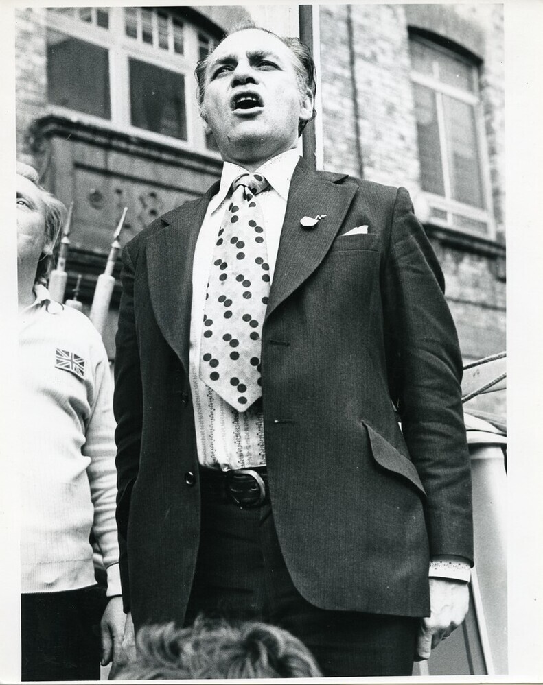 Scope and ContentBlack and white photograph of John Kingsley Read (Chairman of the National Front and founder of the National Party) standing to attention at a National Front demonstration in Hackney, London.