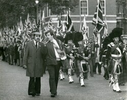 Scope and ContentBlack and white photograph of Martin Webster (right) with an unidentified man on a National Front march showing solidarity with Ian Smith and the Rhodesian whites. There are bagpipers in the foreground and demonstrators carrying Union Jacks in the background