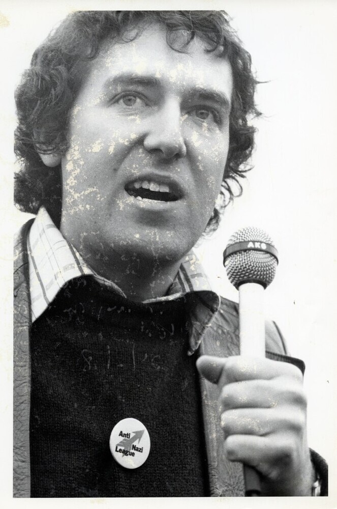 Scope and ContentBlack and white photograph of Peter Hain speaking into a microphone. Caption on the back reads: Peter Hain speaking before mass leafletting and counter canvassing during anti-racist demo, Ilford, 25/2/78