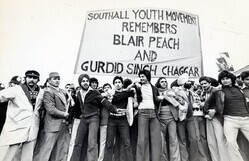 Scope and ContentBlack and white photograph of members of the Southall Youth Movement during a silent march in memory of Blair Peach (teacher and anti-racism campaigner, severely injured by police after a protest against the National Front in Southall on 23 April 1979 who died the day after in hospital) and Gurdip Singh Chaggar (murdered in 1976). There is a banner in the foreground with demonstrators and police officers behind it